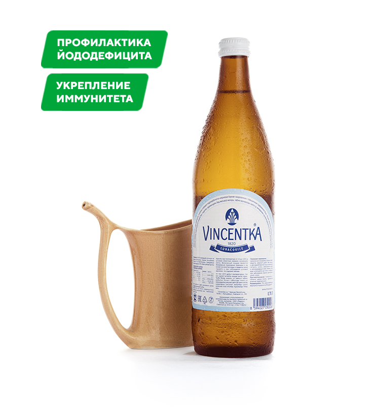 Старейшая чешская минеральная вода известна с 1669 года. В одном глотке Винцентки содержится суточная норма йода для организма человека, особенно необходимого жителям Урала. Основная роль йода – прикрепляться к белковой части молекул, образуя гормоны, которые синтезируются щитовидной железой. Эти гормоны особенно важны для женского организма, они отвечают за поддержание красоты, здоровья и контролируют вес.